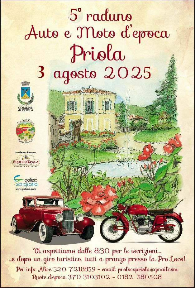 Domenica 03 Agosto 2025 – 5° Raduno Auto e Moto d’Epoca a Priola (CN)