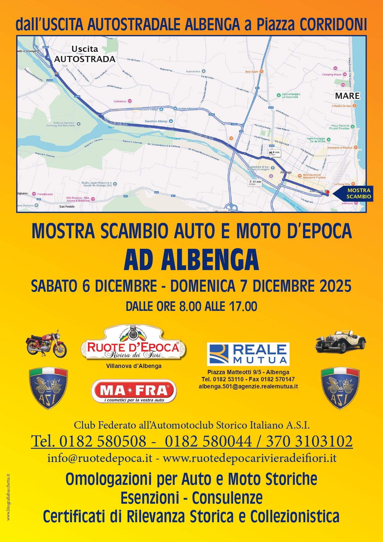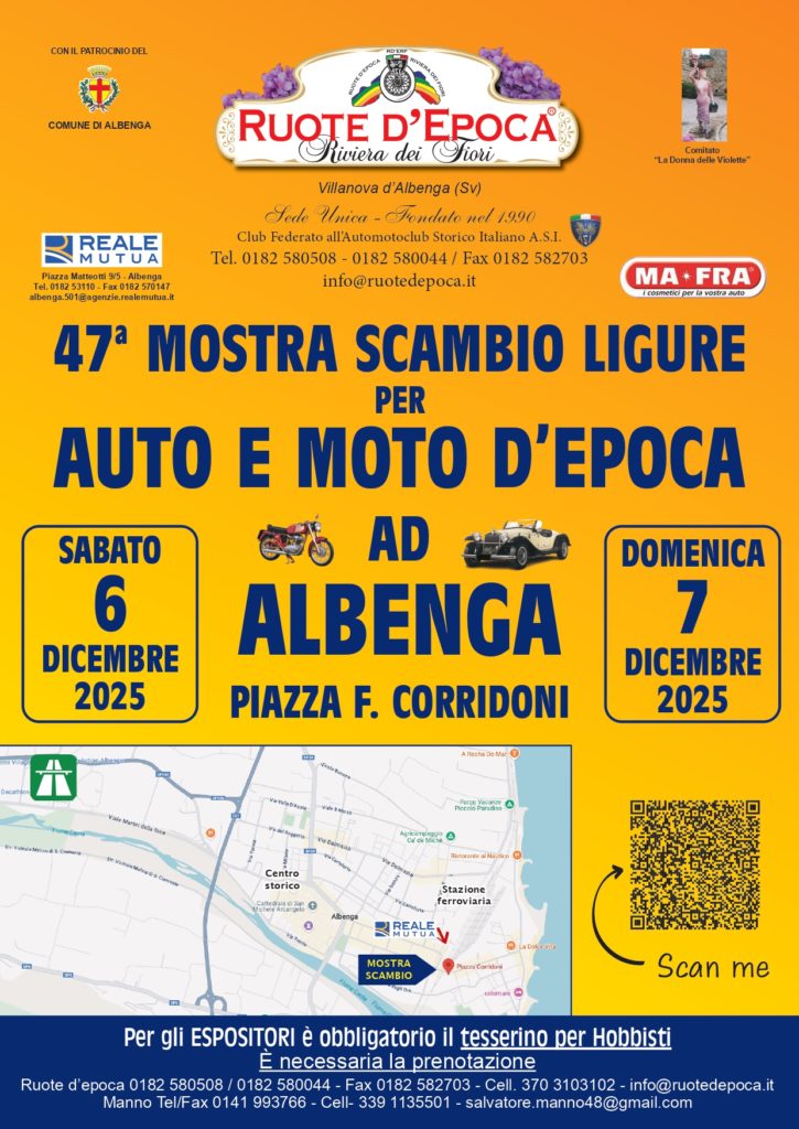 Vi aspettiamo numerosi alla 47° Mostra Scambio Ligure per Auto e Moto d’Epoca ad Albenga in Piazza Corridoni (dietro la stazione ferroviaria) sabato 06 e domenica 07 dicembre 2025.